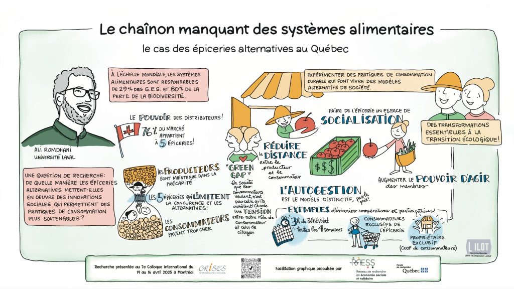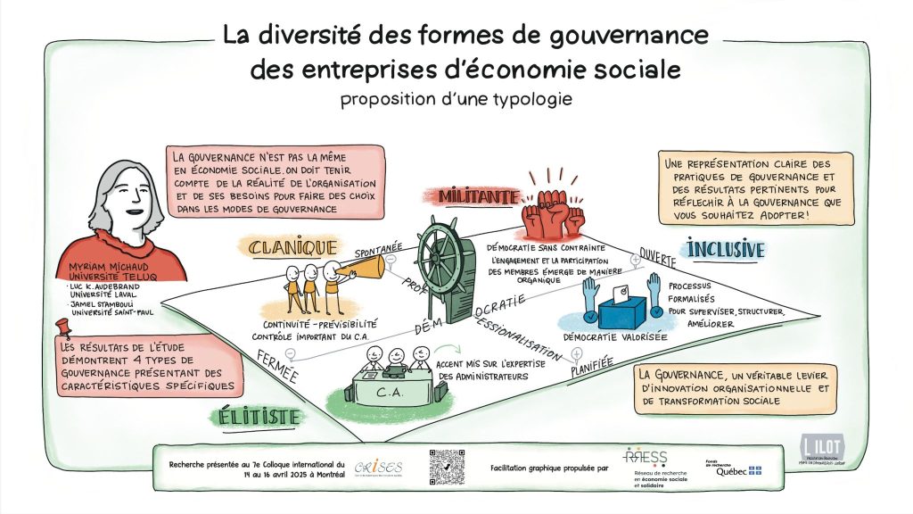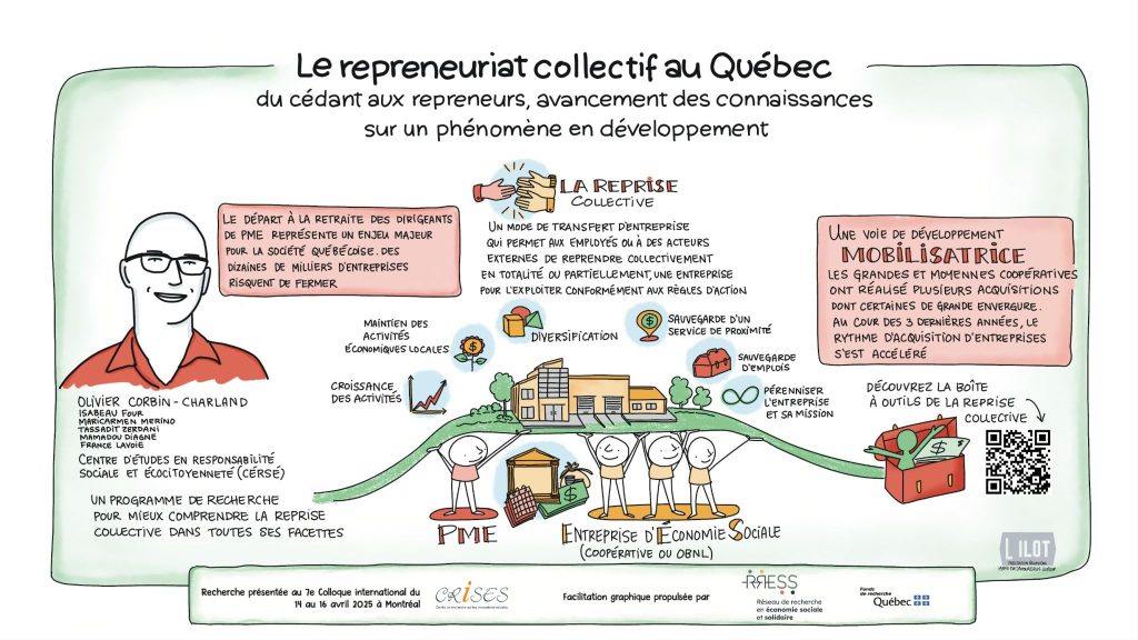 Comment représenter autrement les recherches et pratiques en économie sociale et solidaire ? Lors du 7ᵉ Colloque international du Centre de recherche sur les innovations sociales – CRISES, huit communications ont été illustrées en direct par la facilitatrice graphique Marie-Eve D’Amour, de la coopérative L’ILOT.